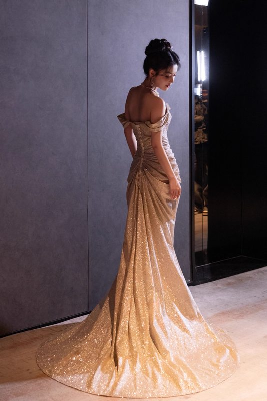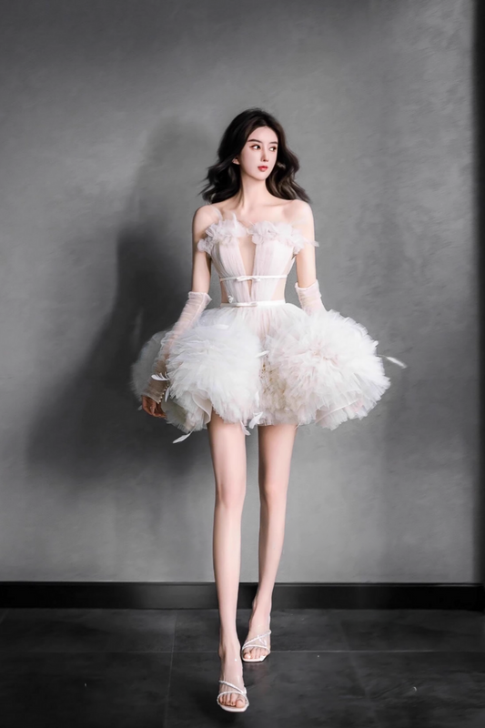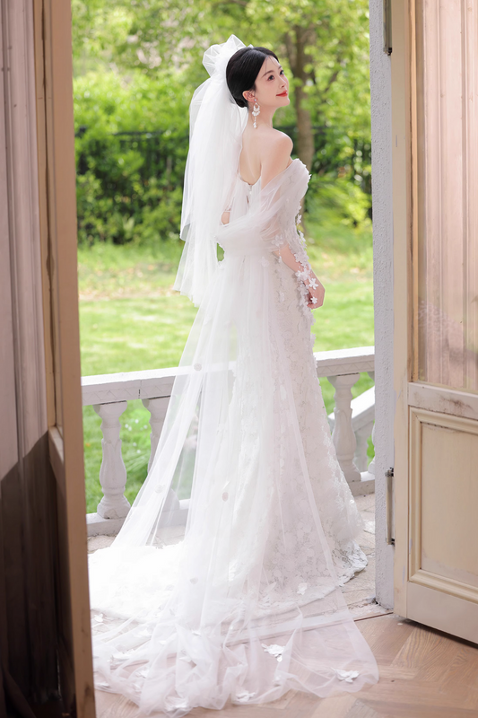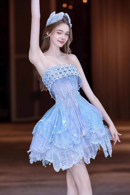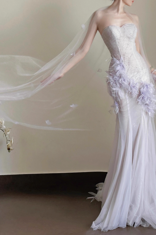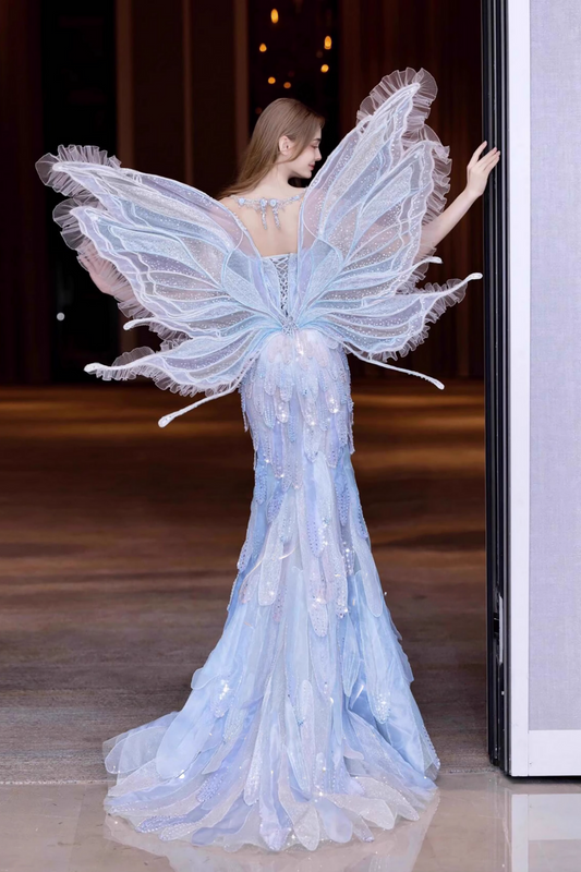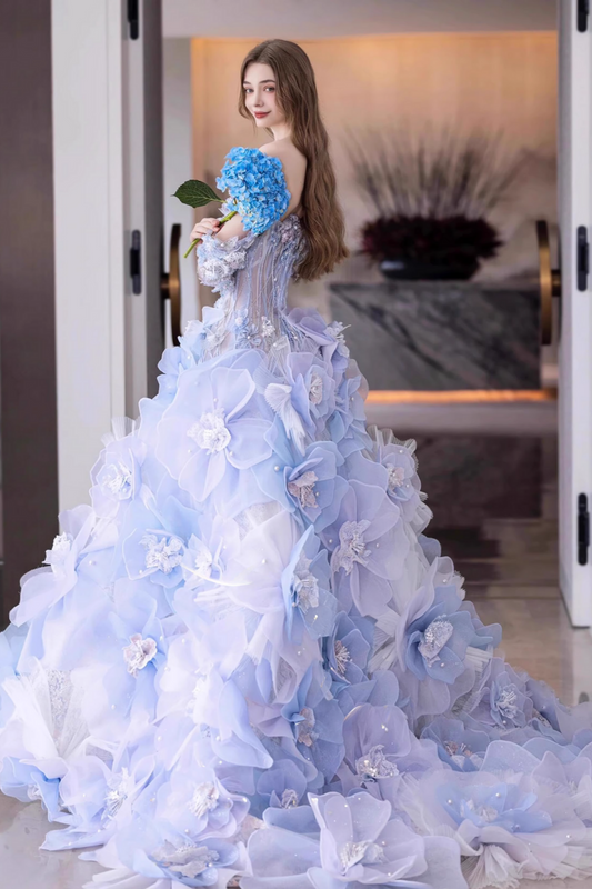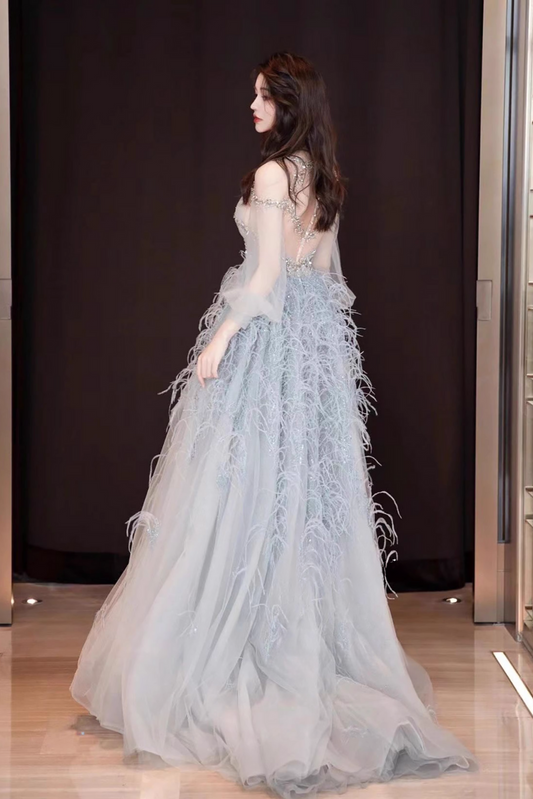 Blue Long Sleeve Ostrich Feathers Long Gown